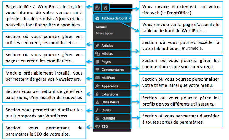 The menu of Wordpress can be scalable because I can install modules or extensions to add features to my website. Let's see in more detail the usefulness of each of these elements :
