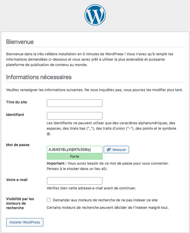 I filled in the fields of this form and then clicked on the "Install Wordpress" button. The login and password correspond to the connection to the back-office. These fields can be modified later in the back-office.